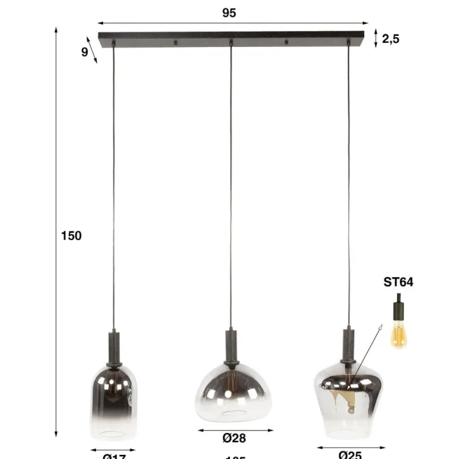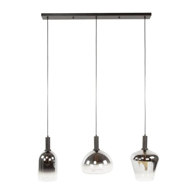 De hanglamp Acme bestaat uit drie zwart pendels. De glazen armaturen hebben elk een eigen vorm en zijn afgewerkt met een subtiel chrome kleurverloop dat het licht op een zachte manier verspreidt.