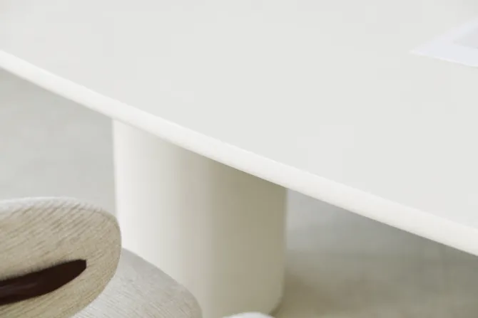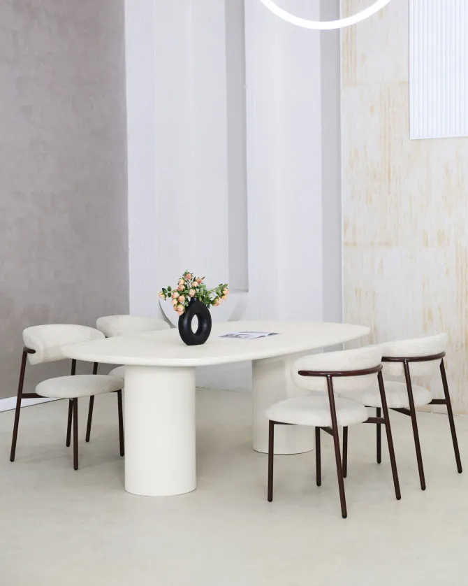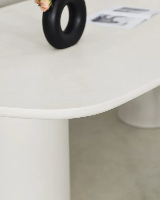 Eetkamertafel Artisano is uitgevoerd in een wit microcement afwerking en heeft een eigentijdse uitstraling met een frisse, moderne look.