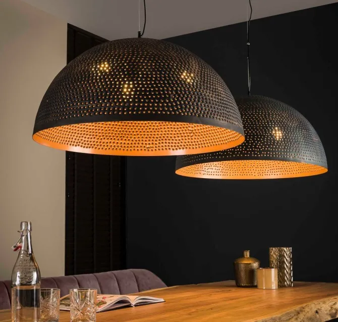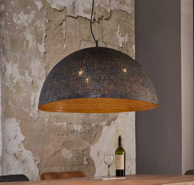 Deze hanglamp is uitgevoerd in metaal in de kleur zwart/bruin. De ronde kap is voorzien van perforator gaatjes, waardoor het licht op een mooie manier erdoor heen schijnt. De kap is voorzien van 3 fittingen. De plafondbevestiging heeft dezelfde zwart/bruine kleur.