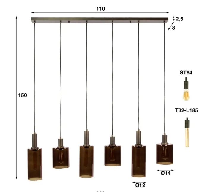 Het ontwerp bestaat uit zes glazen, cilindervormige kappen in twee verschillende formaten. De kappen zijn afzonderlijk in hoogte verstelbaar tot 150 cm. Dit geeft de lamp een speels en elegant karakter.