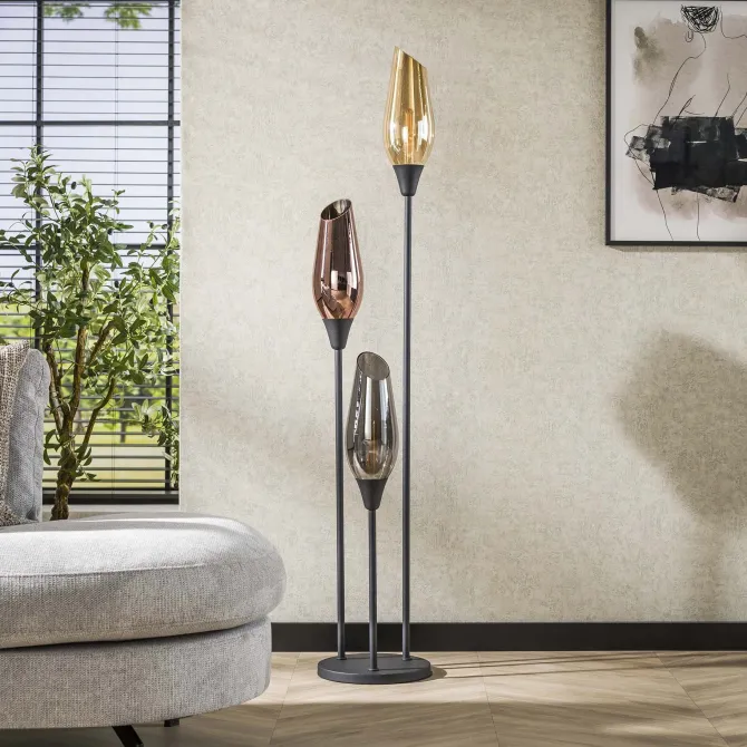 De lamp is uitgevoerd in metaal met drie glazen kappen. De kappen zijn uitgevoerd in drie verschillende kleuren, namelijk: amber kleurig, koper en chroom.