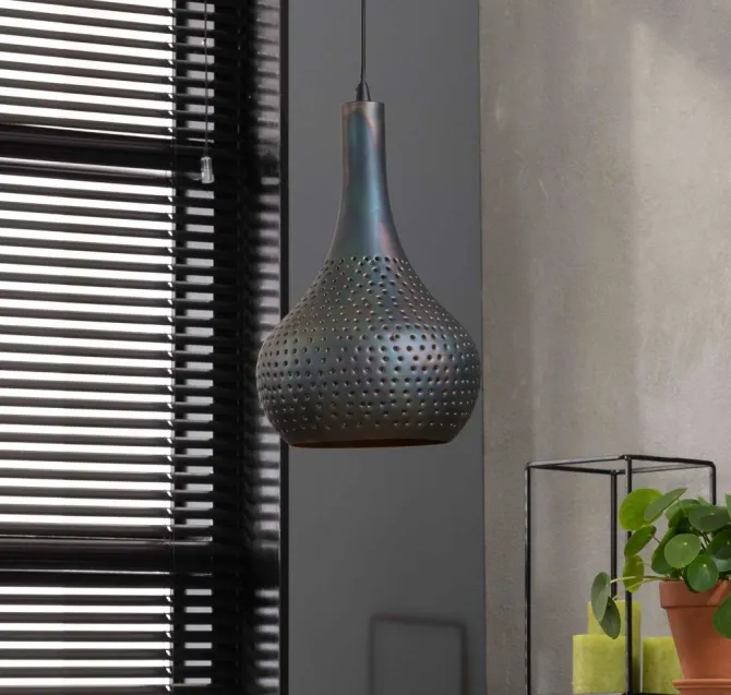 De kegelvormige lampenkap is volledig handmatig geperforeerd, waardoor elke lamp uniek is. De gaatjes maken het model semi-transparant, waardoor het licht sfeervol wordt doorgelaten.