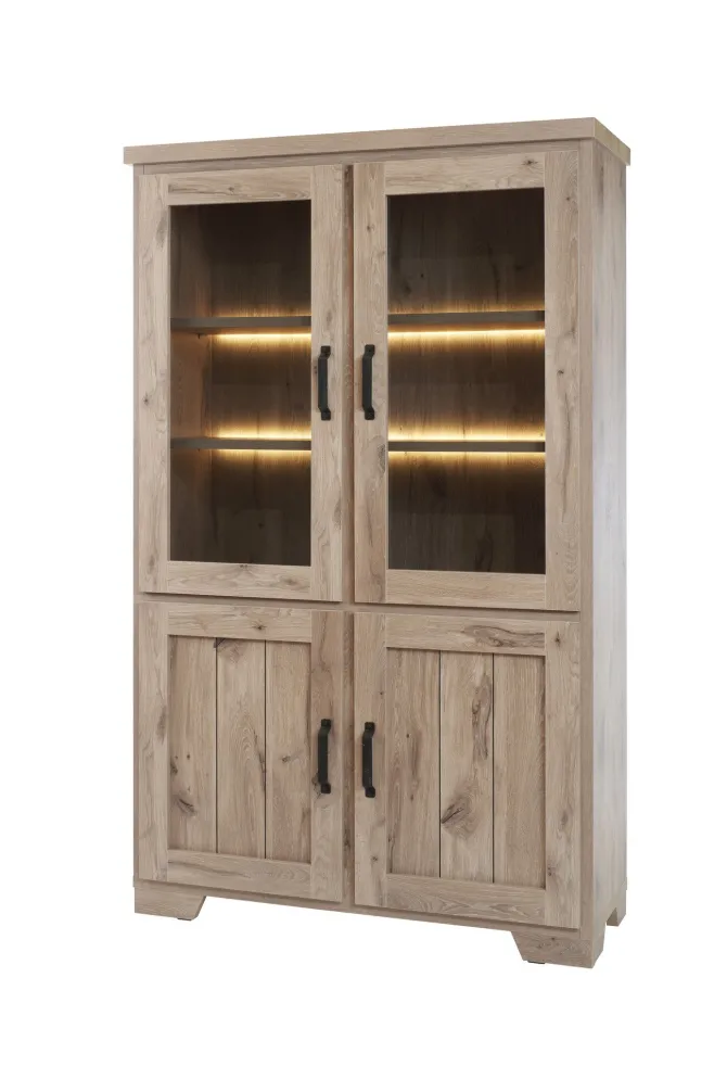 ‘Cesar vitrinekast’ is afgewerkt in lamulux (high pressure laminate) met een natuurlijk eikenhouten kleur, namelijk de kleur ‘Canyon Oak’. Het bovenste deel van de kast, waar de glazen ruiten in de deurtjes zitten, is uitgevoerd met een prachtige LED verlichting.