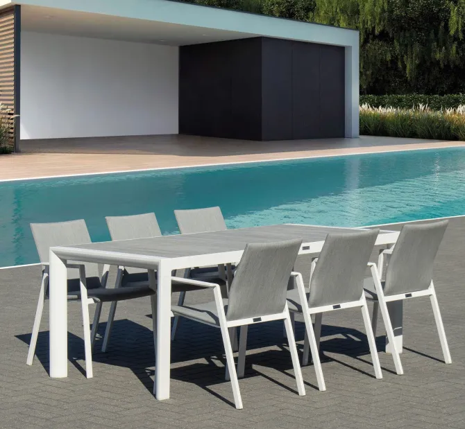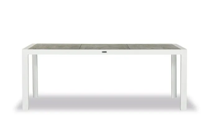 Onderhoudsvriendelijke, duurzame eettafel van 194,5 cm. Bestaande uit een aluminium frame en een keramische toplaag. Onderhoudsvriendelijk en roestvrij!