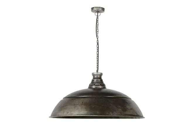 Een industriële grote lamp die mooi boven een ronde eetkamertafel hangt. Het model is uitgevoerd in metaal met een oude zilveren afwerking en hangt aan een stoere ketting.