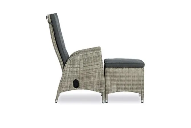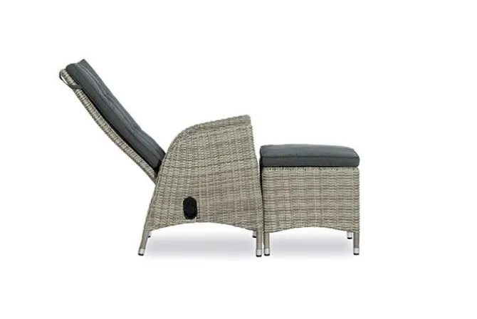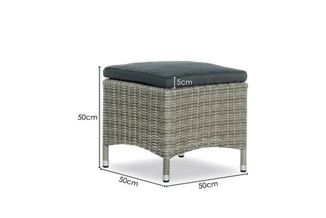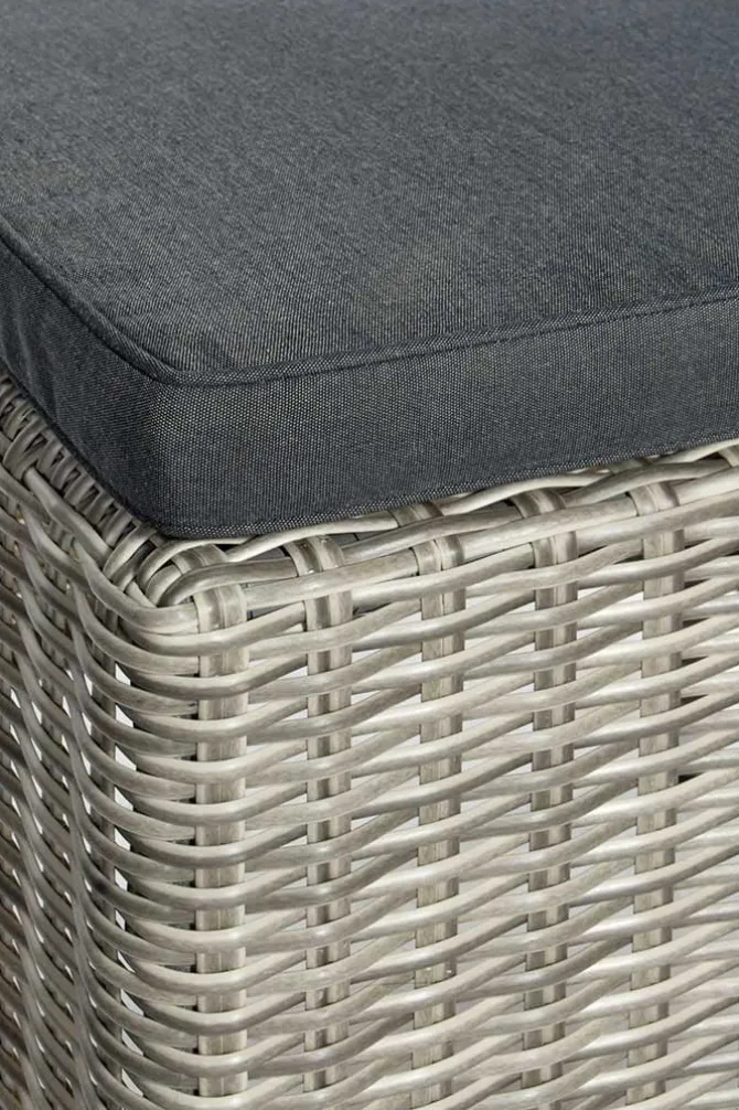 Handige, functionele voetenbank opgebouwd uit een aluminium frame met een halfronde wicker in een frisse lichtgrijze kleur. Wordt geleverd inclusief kussen!Deze compacte voetenbank is niet alleen licht en sterk maar zal buiten ook niet gaan roesten! Ideaal te combineren bij de Elian Outdoor Diningchair of bij meerdere tuinsets. Hij staat op 4 pootjes en heeft een fijne hoogte van maar liefst 44CM! Het kussen is afritsbaar en gemakkelijk te wassen op max. 30 graden.