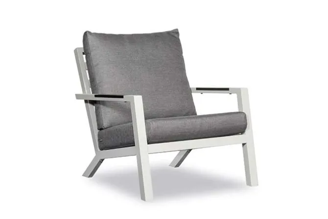 Moderne fauteuil gemaakt van een gepoedercoat aluminium frame, goed gevulde loungekussens. Vrij van onderhoud, roestvrij en makkelijk te verplaatsen.
