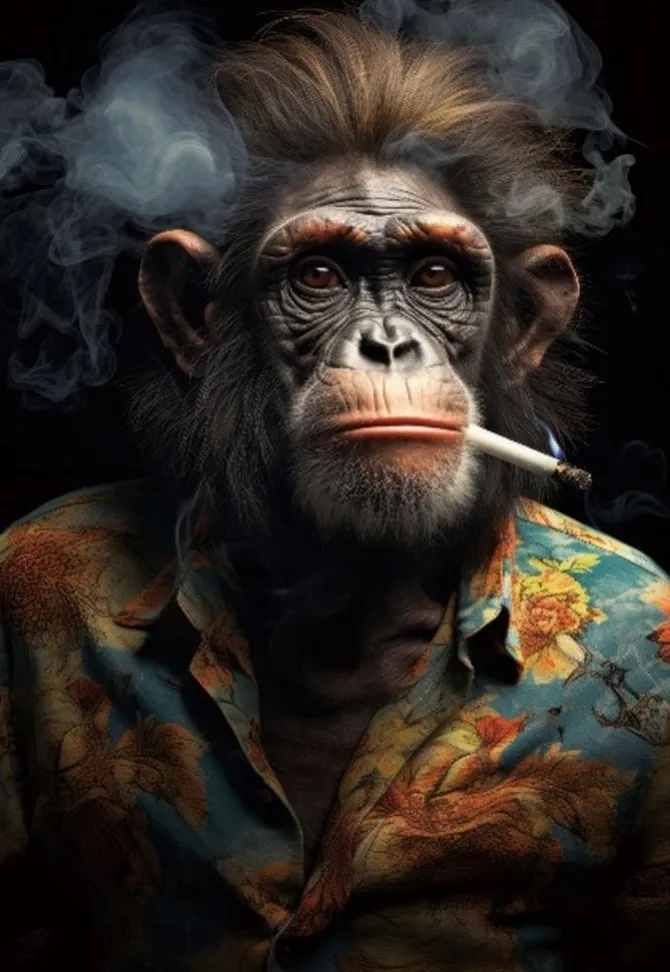 De afbeelding laat een aap zien, die een sigaret rookt, gekleed in een Hawaii-shirt.