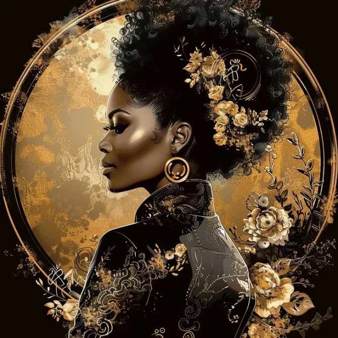 De afbeelding laat een vrouw zien, omringd door een gouden gloed met bloemen.