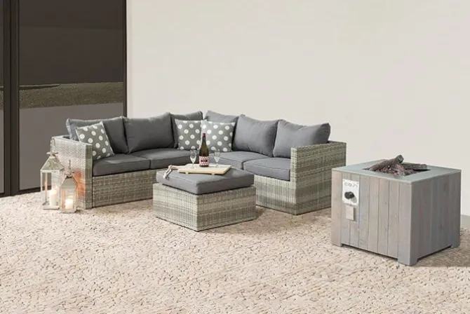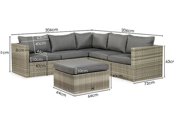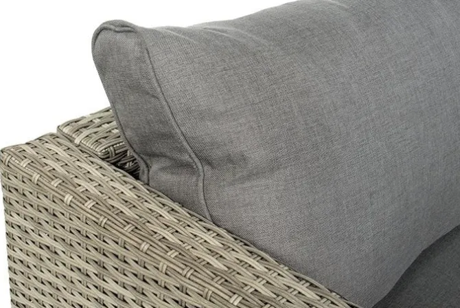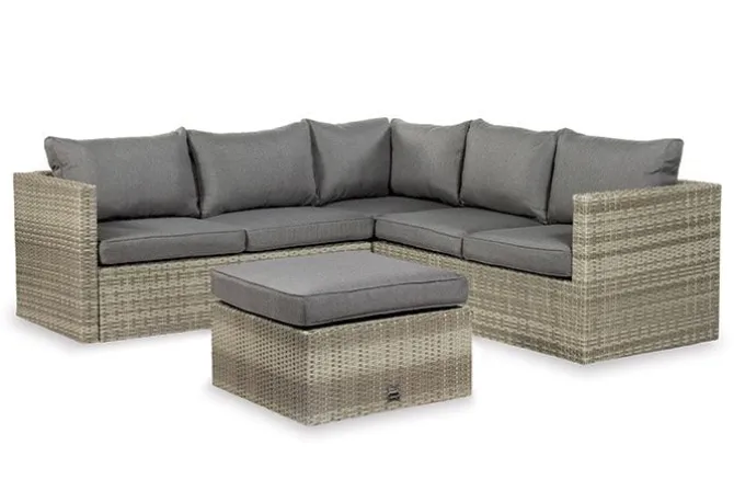 Een compacte hoeklounge set, met fijne lichtgrijze loungekussens die makkelijk zijn op te bergen. Is perfect van formaat voor op uw terras of balkon, gemakkelijk in elkaar te zetten en is geheel onderhoudsvriendelijk.Deze prachtige, comfortabele livingset is ideaal te combineren bij meerdere tuinstijlen door zijn mooie grijs gemêleerde wicker kleur! De Safari Livingset bestaat maar liefst uit 5 zitplaatsen en heeft een losse hocker die zowel als bijzettafel of als extra zitplaats gebruikt kan worden. Vindt u het ook heerlijk om onder het genot van een drankje te genieten van het zonnetje? Dan is deze livingset de ideale set voor u!