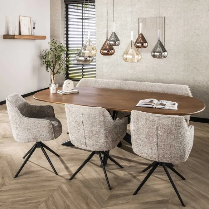 Hanglamp Luvia bestaat uit zeven glazen kappen in druppelvorm, ze hebben diverse formaten en kleuren: amber, koper en chroom. Exclusief lichtbronnen.