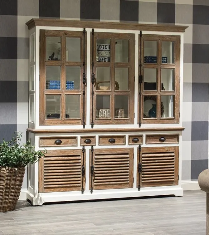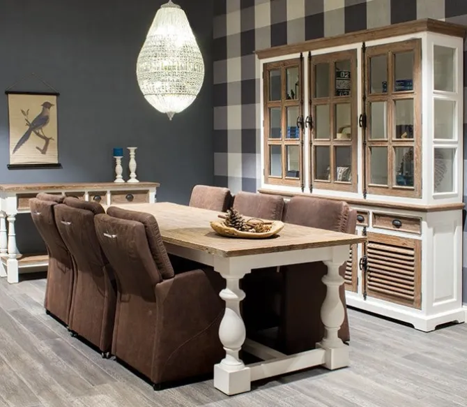 Bezwijk voor het romantische design van deze prachtige landelijke buffetkast. De elegante buffetkast maakt deel uit van onze Martinique collectie en is een echte aanwinst in ieder interieur. De Martinique buffetkast is vervaardigd uit massief grenenhout dat gekenmerkt wordt door zijn prachtige lijnenspel met noesten en windscheurtjes. Het grenenhout is afgewerkt met een greywash om het typerende lijnenspel nog eens extra te benadrukken. De combinatie tussen het wit en de bruine deuren maakt de eigentijdse en landelijke uitstraling compleet. De buffetkast is niet enkel een pronkstuk in uw woonkamer maar ook nog eens zeer praktisch. Dankzij de verschillende deuren en diepe schuiflades beschikt u over voldoende opbergruimte. Zo kan u onderaan discreet een aantal items uit het zicht opbergen en de decoratie stukken die wel gezien mogen worden kan u etaleren achter de 4 grote glazen deuren. Alle deuren zijn voorzien van een gedetailleerd handvat waarmee u de deuren kan vergrendelen.