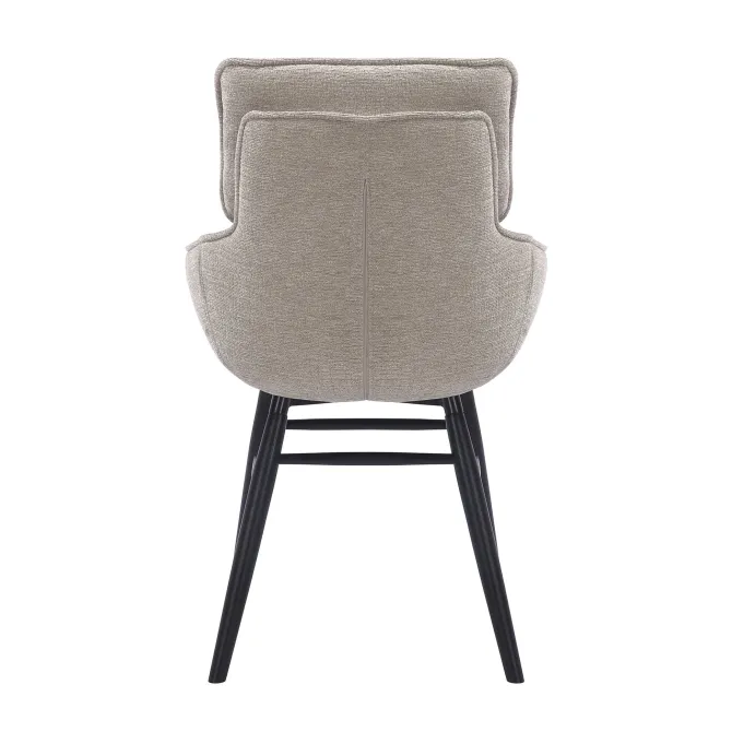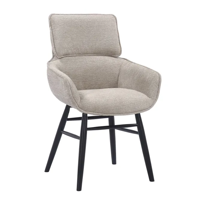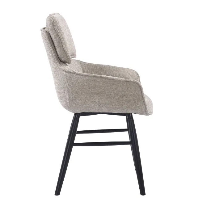 De Matera eetkamerstoel combineert stijl en comfort in een elegant ontwerp. Met een zachte, bouclé-achtige bekleding en een ergonomisch gevormde rugleuning met extra kussen, biedt deze stoel een heerlijke zitervaring. De armleuningen zorgen voor extra ondersteuning, terwijl het stevige metalen onderstel bijdraagt aan een stabiele en moderne uitstraling. Verkrijgbaar in een warme, neutrale tint die moeiteloos in diverse interieurs past.