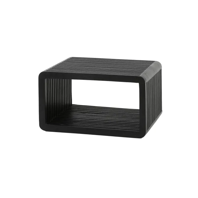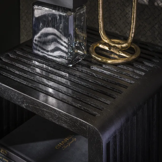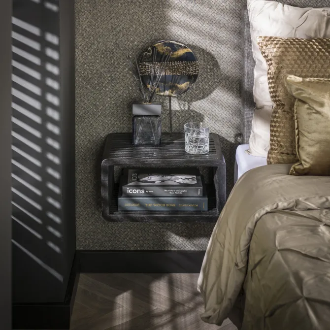 Het nachtkastje is afgewerkt met een zwarte finish en beschikt over één open vak. Het wordt eenvoudig aan de muur bevestigd met een strip met drie schroefgaten, waardoor het zweeft en ruimte bespaart.