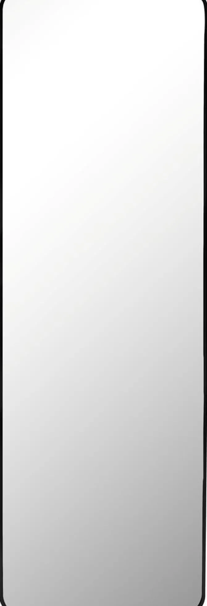 Moderne rechthoekige passpiegel inclusief standaard en afgeronde hoeken. Afgewerkt met aluminium lijst.