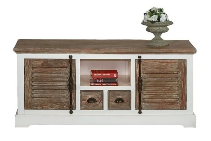 Het romantische design van deze tv-kast in combinatie met zijn landelijke uitstraling maakt van deze tv-kast een echte eye-catcher in ieder interieur. De elegante tv-kast behoort tot onze Martinique collectie en is vervaardigd uit massief grenenhout. Men kan het grenenhout herkennen aan het prachtige lijnenspel met noesten en windscheurtjes. Het grenenhout is afgewerkt met een greywash om het typerende lijnenspel nog eens extra te benadrukken. Dit maakt de Martinique tv-kast een echte aanwinst in ieder interieur! De combinatie tussen het wit en de bruine deuren maakt de eigentijdse en landelijke uitstraling compleet. De tv-kast is niet enkel een eye-catcher in uw interieur maar is ook nog een zeer praktisch. Dankzij de ruime deuren en diepe lades beschikt u over voldoende opbergruimte voor al uw apparatuur. Zo is er ook nog eens een open vak voorzien voor bijvoorbeeld uw digicorder. Alle deuren zijn voorzien van een gedetailleerd handvat waarmee u de deuren kan vergrendelen.