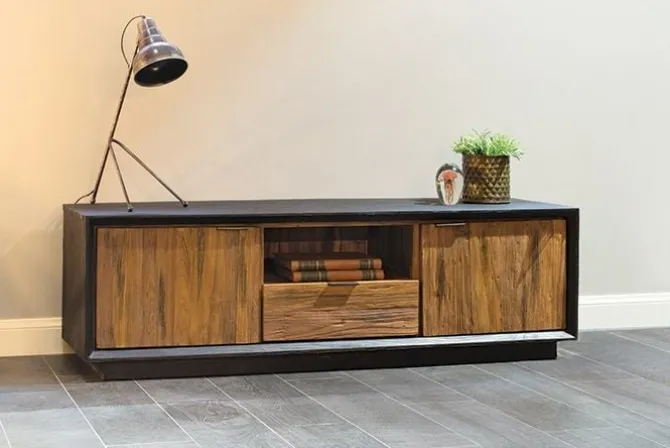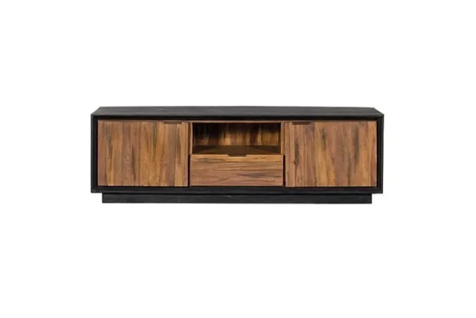 Bent u ook een echte liefhebber van een woonruimte die sfeer en karakter uitstraalt? Dan is de Mountain tv-cabinet de perfecte match voor u! De Mountain Tv-cabinet is vervaardigd uit massief geborsteld teakhout, dit geeft de Mountain collectie een warme en sfeervolle uitstraling. De Mountain tv-cabinet voldoet aan de laatste woontrends dankzij het zwart geborstelde teakhouten frame dat in combinatie met teakhout de collectie een stoer en uniek karakter geeft. De tv-kast is niet enkel een pronkstuk in uw woonkamer, maar u beschikt ook nog eens over voldoende opbergruimte dankzij de praktische indeling. Er is een open vak voorzien voor uw apparatuur maar ook 2 grote deuren en een diepe lade zodat u voldoende items uit het zicht kan opbergen.