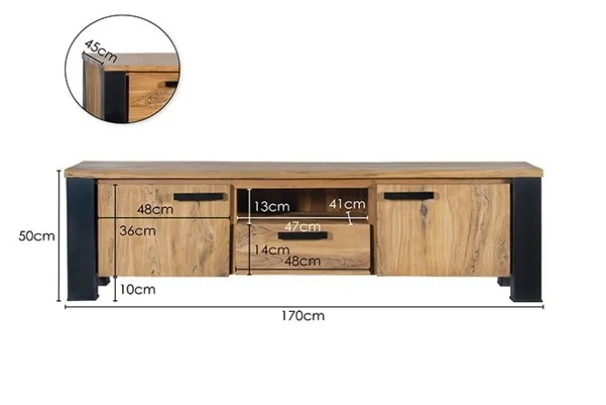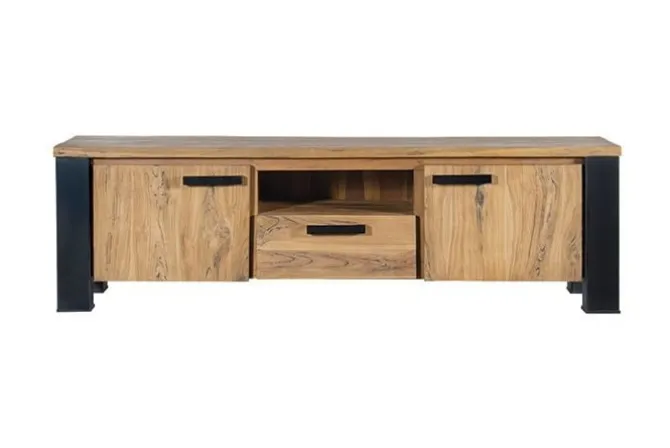 Bent u op zoek naar een stijlvolle tv-kast met veel opbergruimte? Dan is de Woodstock tv-kast de oplossing. Deze prachtige en stijlvolle tv-kast maakt deel uit van onze nieuwe Woodstock collectie en is vervaardigd uit massief geborsteld teakhout met een stoere blackwash finish. De blackwash finish geeft de woodstock collectie een robuuste industriële uitstraling. Het stalen frame van deze tv-kast in combinatie met het geborstelde teakhout maakt van deze tv-kast een echte aanwinst in ieder interieur! het tijdloze design kan gecombineerd worden met meerdere woonstijlen en is een echte eye-catcher. Dankzij zijn ruime lade en 2 grote deuren beschikt u over voldoende opbergruimte om uw spullen of apperatuur in op te bergen!