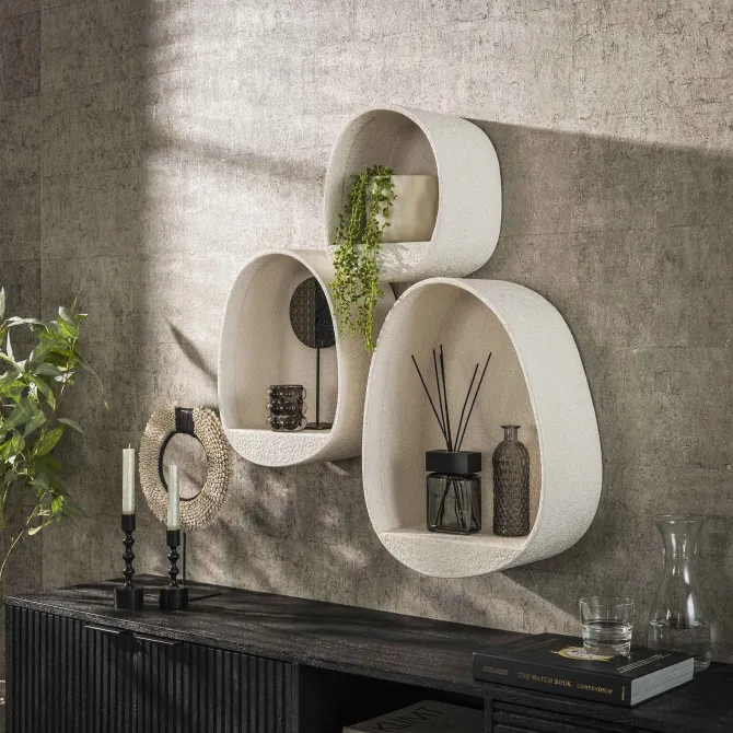 Wandschapset Vero bestaat uit drie druppelvormige schappen van marmercomposiet.