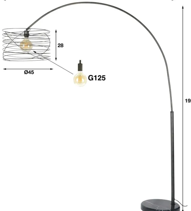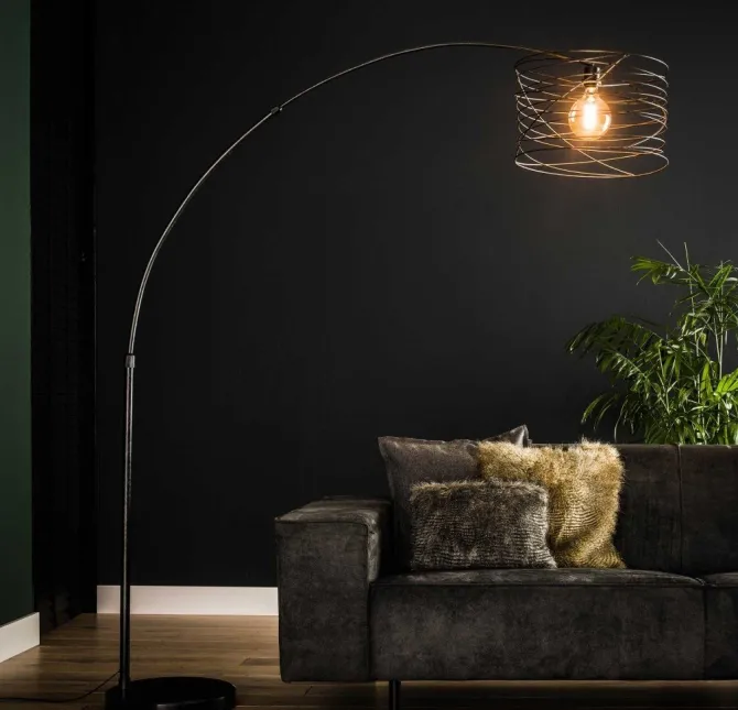 Deze booglamp is voorzien van een ronde lampenkap in de vorm van een spiraal. De lamp is uitgevoerd in metaal met een donkere ‘charcoal’ kleur. De ronde voet is gemaakt van zwart marmer. Exclusief lichtbron.