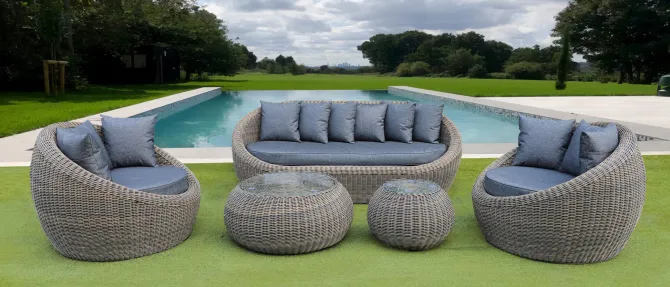 Deze set bestaat uit: 1 tuinbank, 2 tuinstolen, 2 cofee table, inclusief alle zit-en rugkussens