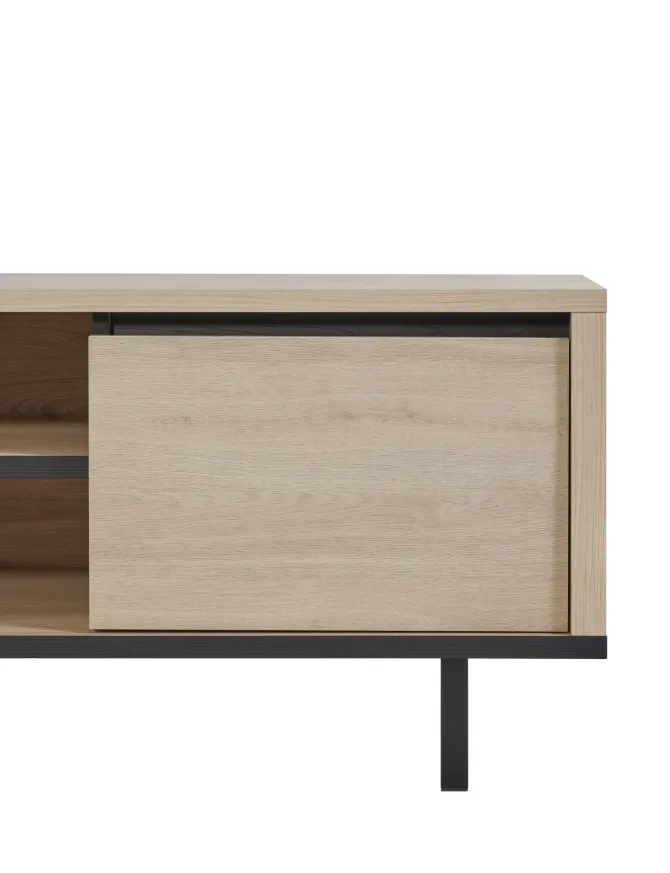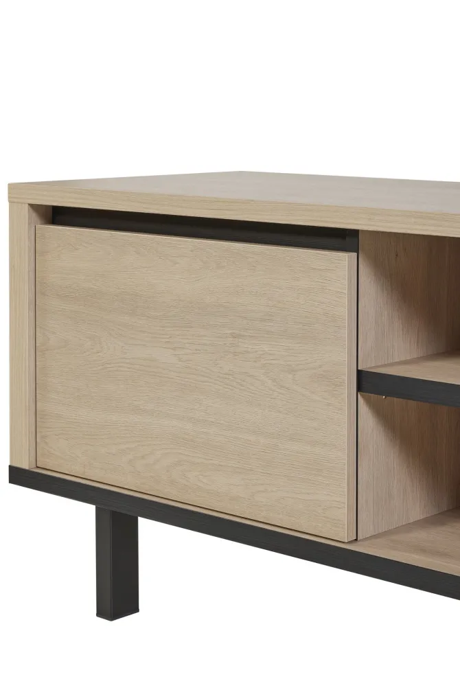 De TV-kast is afgewerkt in lamulux (high pressure laminate) met een natuurlijk eikenhouten kleur, namelijk de kleur ‘Urban Oak’.