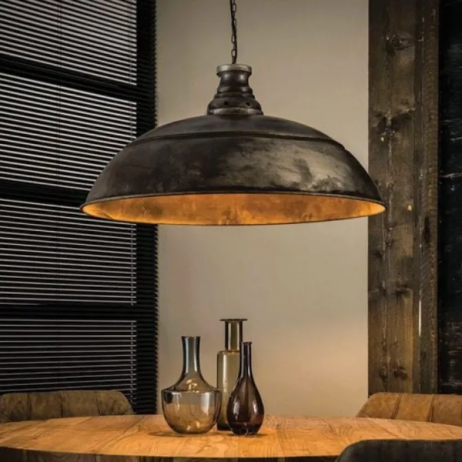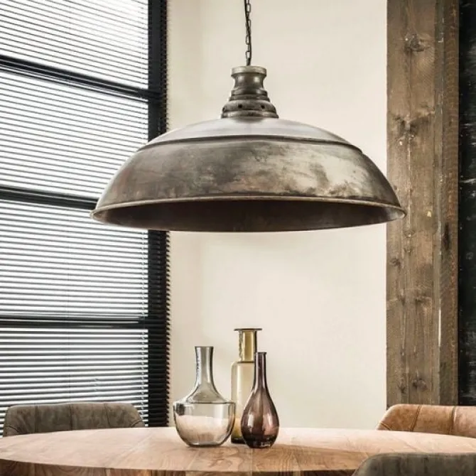 Een industriële grote lamp die mooi boven een ronde eetkamertafel hangt. Het model is uitgevoerd in metaal met een oude zilveren afwerking en hangt aan een stoere ketting.