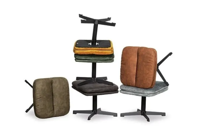 De hocker is verkrijgbaar in 6 kleuren en te combineren met verschillende bijpassende draaifauiteuils:
