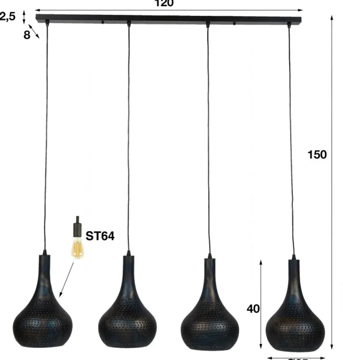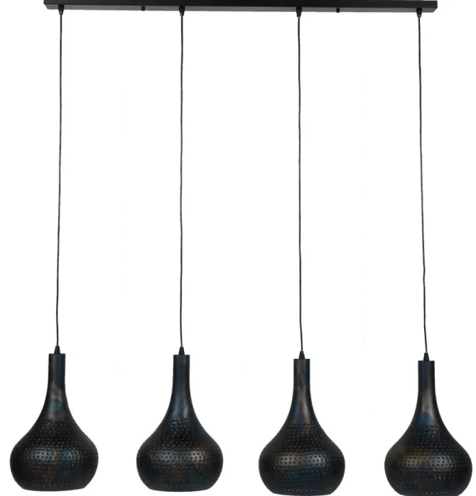 Deze 4-lichts hanglamp, inclusief de plafondbevestiging, is uitgevoerd in grijs of zwart/bruin metaal. Exclusief lichtbronnen.