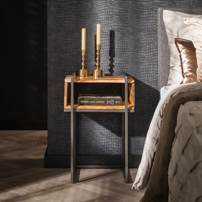 Industriële stijl met rustieke toets nachtkasje Levi. Was u opzoek naar die natuurlijke uitstraling van het acacia hout of juist het industrieel grijs gepoedercoate frame om een statement te maken in de slaap- of logeerkamer?