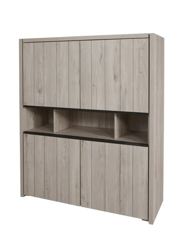 Het heeft een eikenhouten look met greywash, waardoor de meubels een frisse licht grijze kleur hebben. De omkadering en details in de meubels zijn in het zwart afgewerkt om net wat meer finesse aan de meubels te geven.