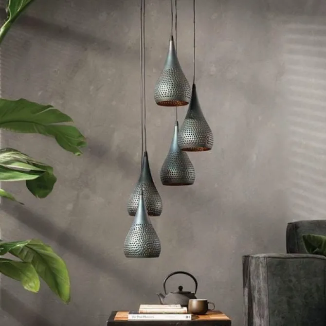 De lamp heeft 5 druppelvormige kappen (Ø15 cm) getrapt zijn wat zorgt voor een speels effect. De kappen zijn geperforeerd in combinatie met een bronze binnenkant wat ervoor zorgt dat het licht sfeervol en gedoseerd door de ruimte wordt verdeeld.