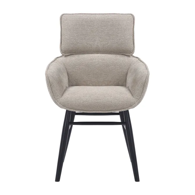De Matera eetkamerstoel combineert stijl en comfort in een elegant ontwerp. Met een zachte, bouclé-achtige bekleding en een ergonomisch gevormde rugleuning met extra kussen, biedt deze stoel een heerlijke zitervaring. De armleuningen zorgen voor extra ondersteuning, terwijl het stevige metalen onderstel bijdraagt aan een stabiele en moderne uitstraling. Verkrijgbaar in een warme, neutrale tint die moeiteloos in diverse interieurs past.