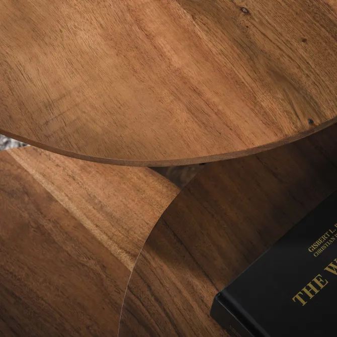 Deze set van drie salontafels is gemaakt van massief acaciahout. De stevige voet is vervaardigd uit één stuk acaciahout, wat zorgt voor een robuuste uitstraling.