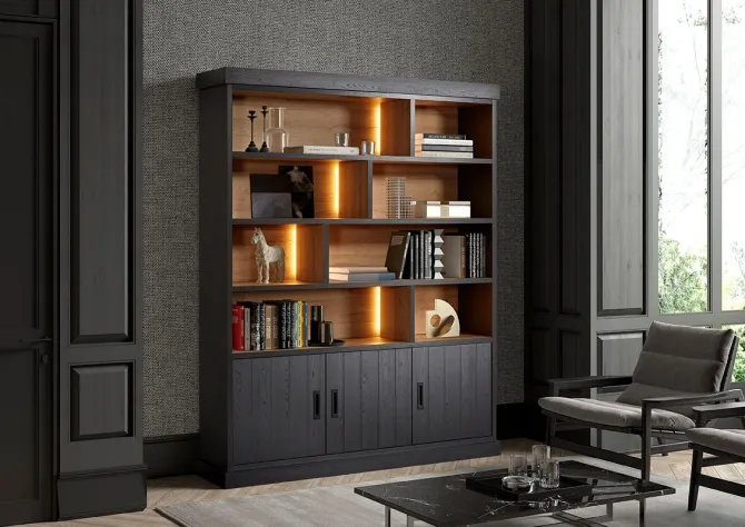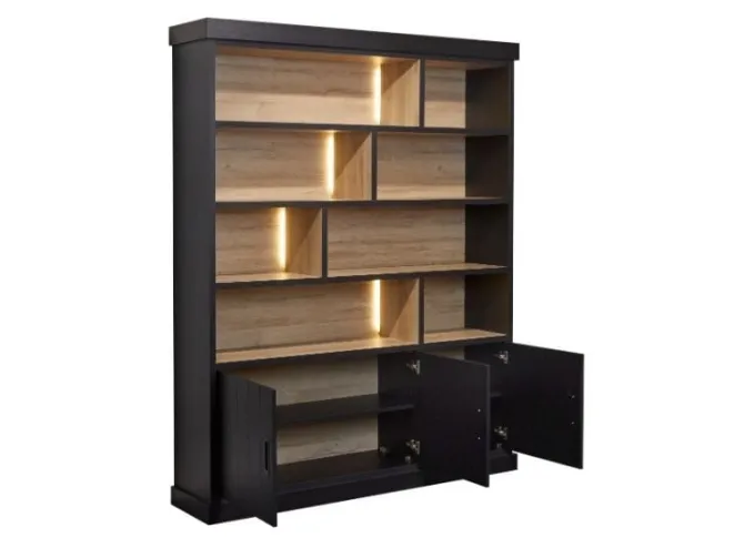 Nu heel voordelig geprijsd, ‘Samuel wandkast’ is afgewerkt in lamulux (high pressure laminate) met een zwarte look aan de buitenkant en natuurlijk eikenhouten kleur aan de binnenkant. Het bovenste deel van de kast, bij alle open schappen, is uitgevoerd met een prachtige LED verlichting.