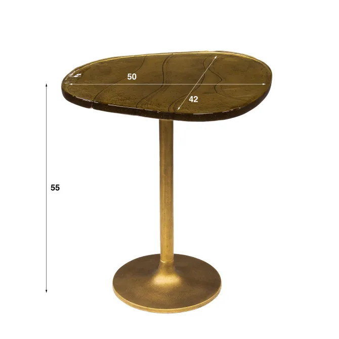 De bijzettafel is voorzien van een tafelblad van getrokken glas.