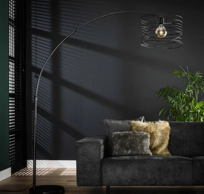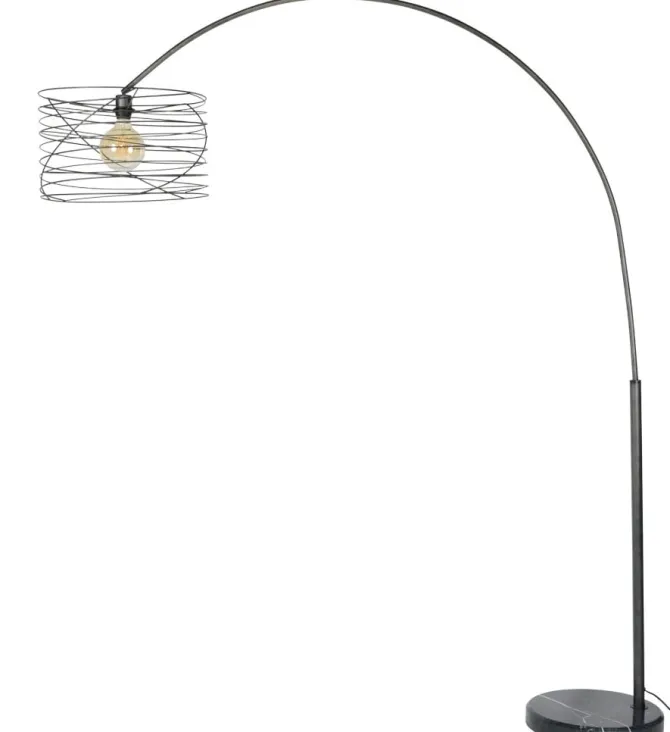 Deze booglamp is voorzien van een ronde lampenkap in de vorm van een spiraal. De lamp is uitgevoerd in metaal met een donkere ‘charcoal’ kleur. De ronde voet is gemaakt van zwart marmer. Exclusief lichtbron.