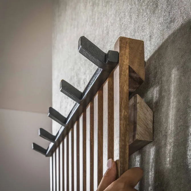 De kapstok beschikt over 14 metalen haakjes. De spijlen geven deze kapstok een eigentijdse look.